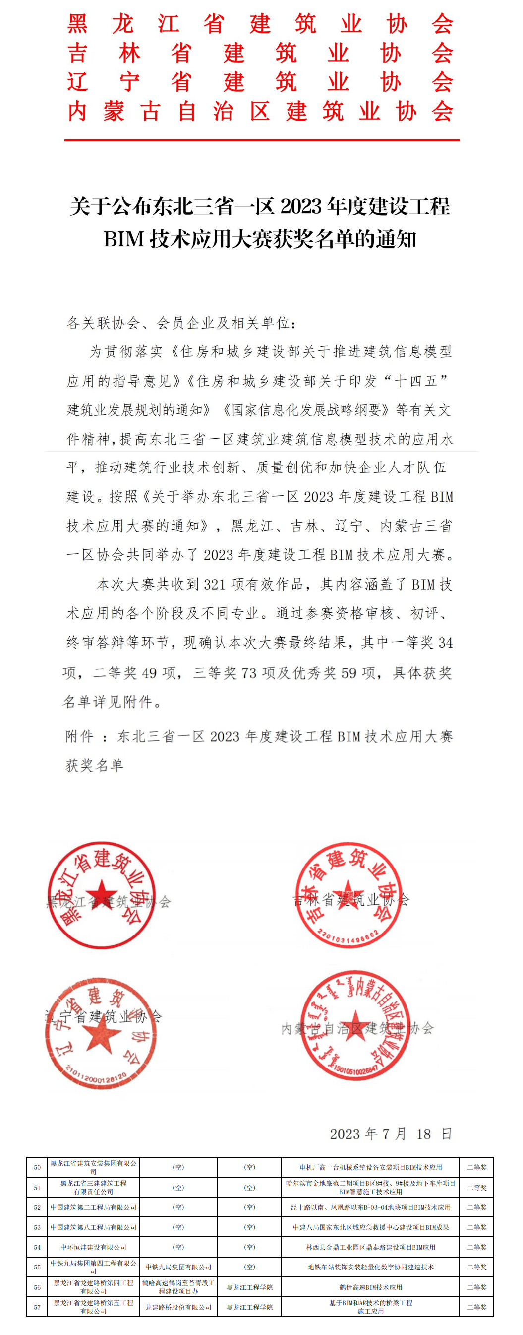 為貫徹落實《住房和城鄉建設部關于推進建筑信息模型應用的指導意見》《住房和城鄉建設部關于印發“十四五”建筑業發展規劃的通知》《國家信息化發展戰略綱要》等有關文件精神,提高東北三省一區建筑業建筑信息模型技術的應用水平,推動建筑行業技術創新、質量創優和加快企業人才隊伍建設。按照《關于舉辦東北三省一區2023年度建設工程BIM技術應用大賽的通知》,黑龍江、吉林、遼寧、內蒙古三省一區協會共同舉辦了2023年度建設工程BIM技術應用大賽。本次大賽共收到321項有效作品,其內容涵蓋了BIM技術應用的各個階段及不同專業。通過參賽資格審核、初評項,二等獎49項,三等獎73項及優秀獎59項,具體獲獎名單詳見附件。
